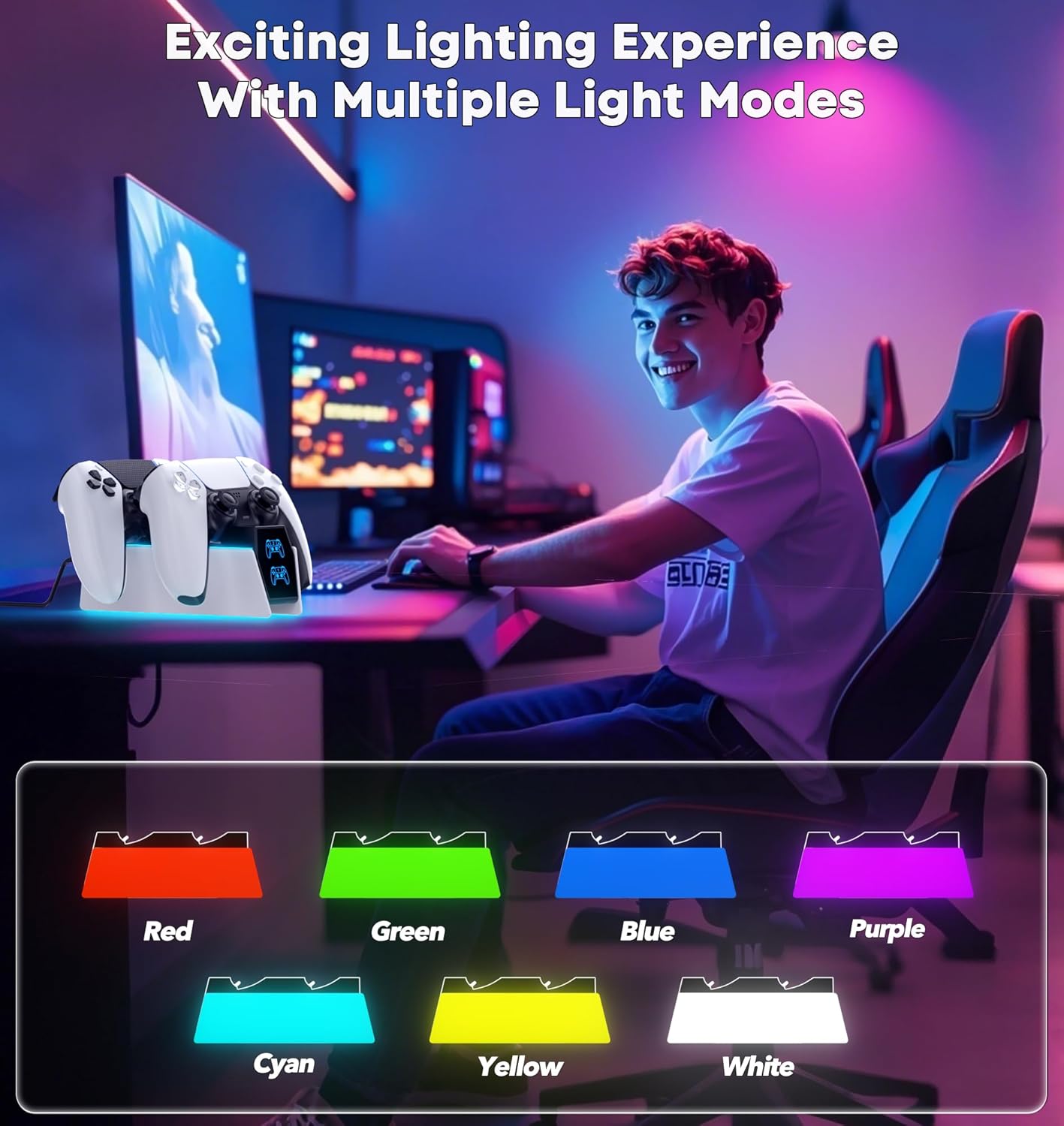- Effortless Charging:Simply place two PS5 controllers on the charger base and the PS5 remotes begin charging. A bright LED indicator will show the charging status. The PS5 Accessories Kits charging lights on the front unlike the official version, will be indicated with red and blue lights to show whether they are charging or fully charged. The unique LED strap on the screen will flash while in charging status. Additionally, the blue lighting on both sides combines to give a nice look with the PS5 controllers.