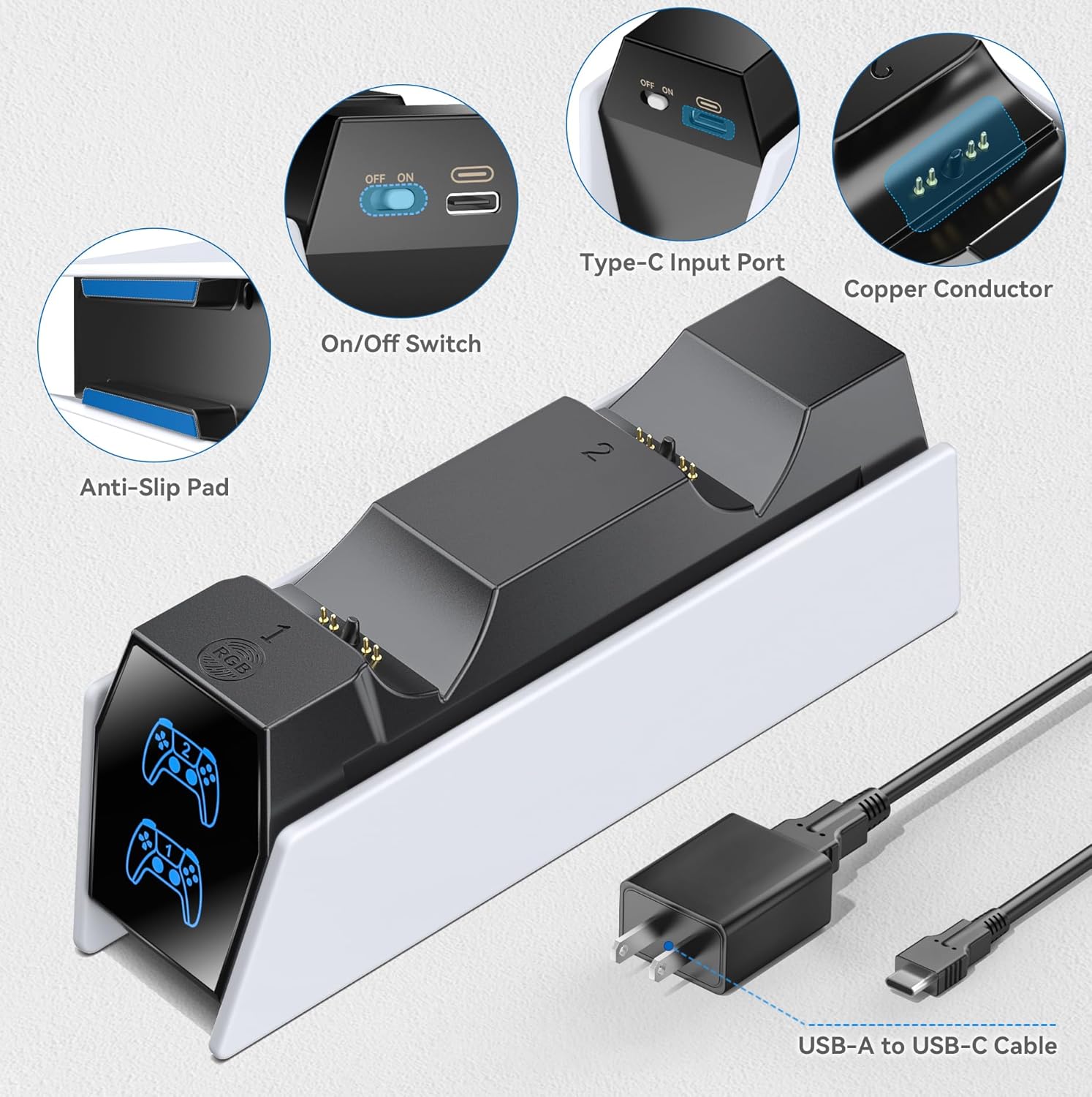 Anti-slip rubber pads keep the PS5 controller charger firmly in place, enough to support the weight of the them.